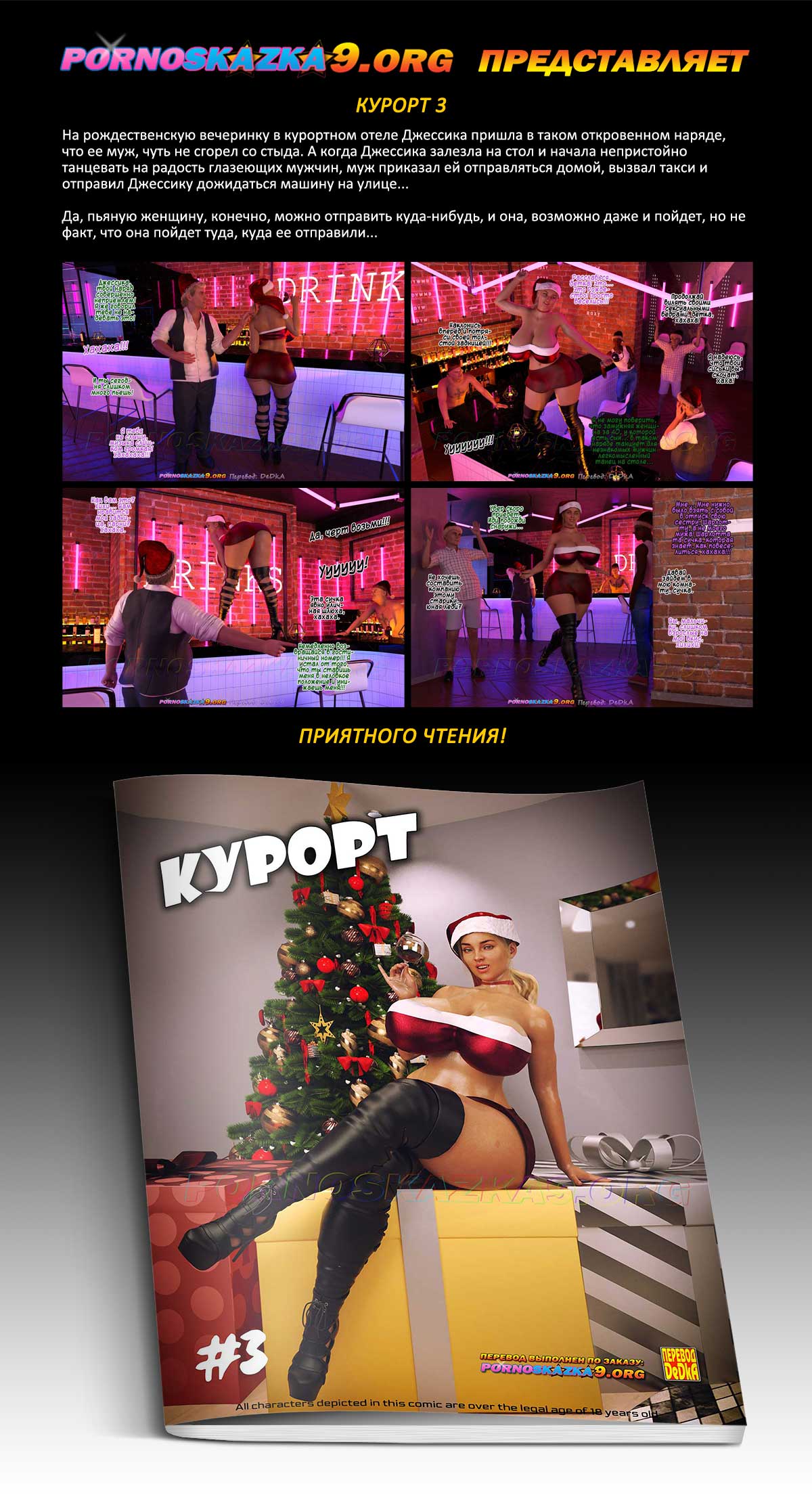 Порно комикс «Курорт. Часть 3.» Во время секса со своей невероятно требовательной любовницей, Джессикой, Джонни от сильного возбуждения допустил одну досадную ошибку и за это был отстранен ею от ее тела до утра следующего дня. Сама же Джессика тем же вечером, по случаю, завела себе сразу двоих новых любовников и, проверив их на деле, осталась вполне довольна, тем более, что они оказались ее земляками, и она планирует встречаться с ними и после возвращения с курорта. Ну а пока, курортная жизнь дарит новые приключения, не всем, конечно, а только тем, чьи задницы ищут этих приключений…